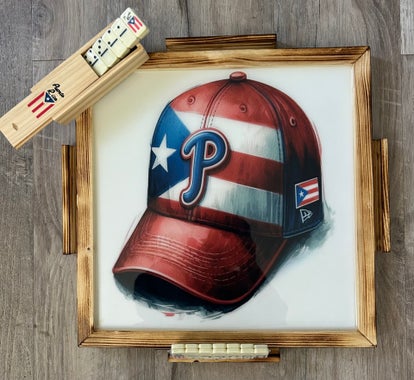 Mini mesa de domino para los boricuas que son fanaticos de los "phillies" en madera solida con cubierta en resina. Ideal para llevar tu juego a cualquier lugar o para hacer un regalo unico a tu ser querido. Medidas 13" x 13". ( Incluye los mini dominos )