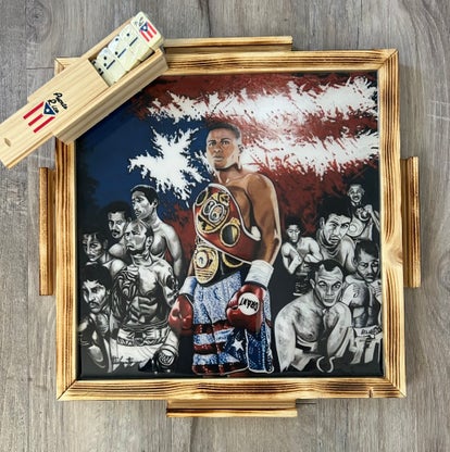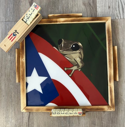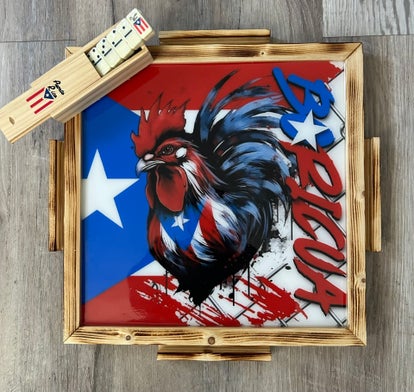 Mini mesa de domino "campeones de PR" en madera solida con cubierta en resina. Ideal para llevar tu juego a cualquier lugar o para hacer un regalo unico a tu ser querido. Medidas 13" x 13". ( Incluye los mini dominos )
