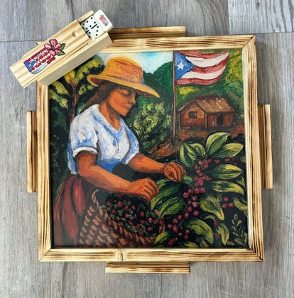 Mini mesa de domino "recogiendo cafe" en madera solida con cubierta en resina. Ideal para llevar tu juego a cualquier lugar o para hacer un regalo unico a tu ser querido. Medidas 13" x 13". ( Incluye los mini dominos )