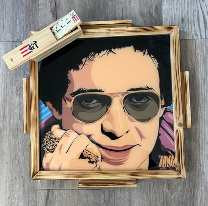 Mini mesa de domino "Hector Lavoe" en madera solida con cubierta en resina. Ideal para llevar tu juego a cualquier lugar o para hacer un regalo unico a tu ser querido. Medidas 13" x 13". ( Incluye los mini dominos )