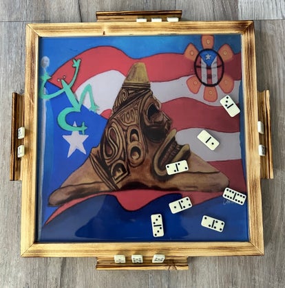 Mini mesa de domino "simbolos tainos" en madera solida con cubierta en resina. Ideal para llevar tu juego a cualquier lugar o para hacer un regalo unico a tu ser querido. Medidas 13" x 13". ( Incluye los mini dominos )
