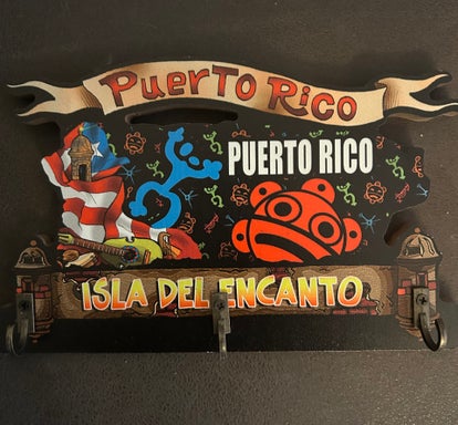 Wall keyholder with PR map, coqui frog and el morro. Measurements 9" x 3 1/8" (wood)