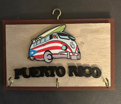 Porta llaves con la Volkswagen playera de PR en madera. Medidas: 7" x 4 1/2"