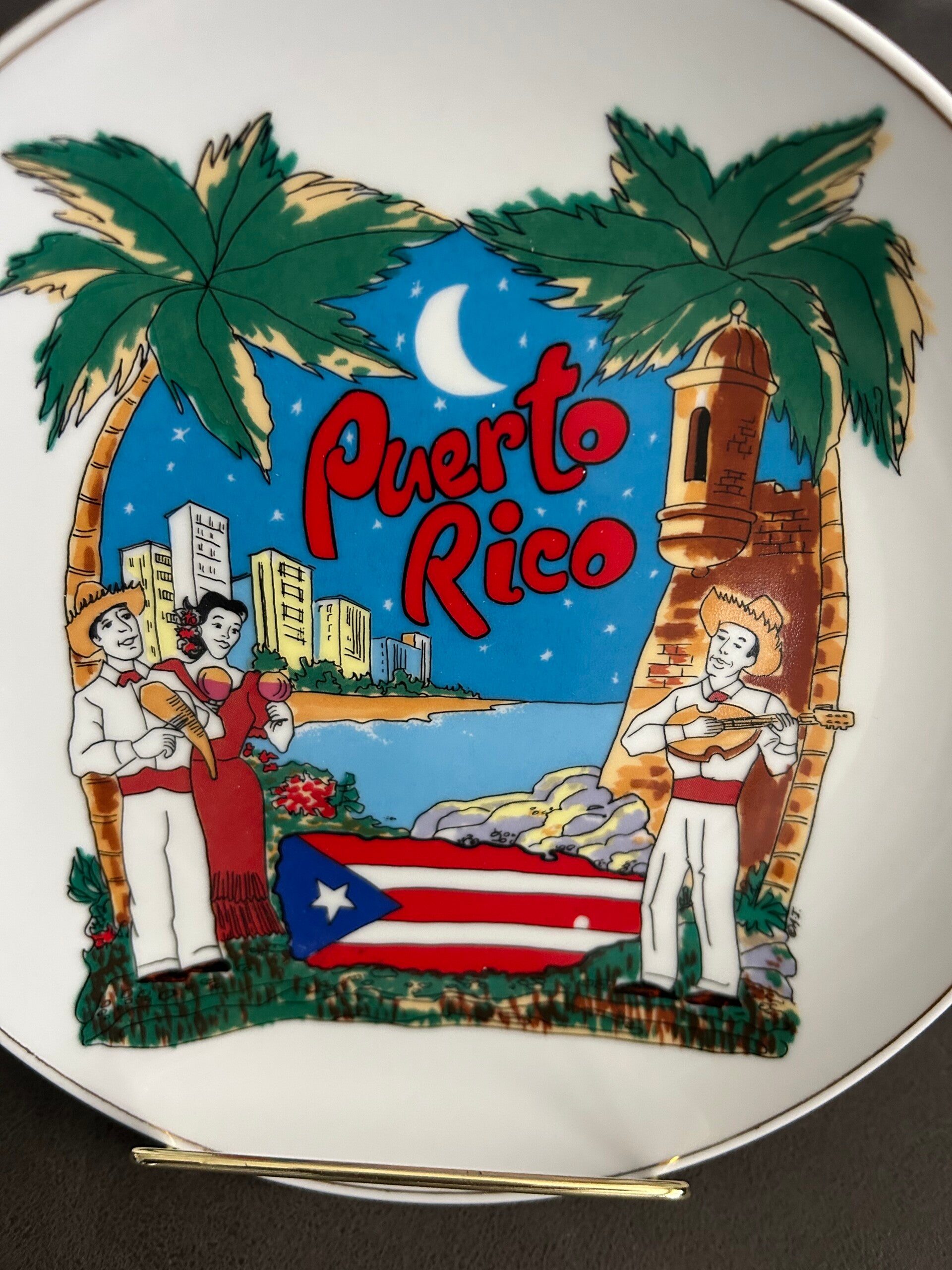 Beautifull 8" retro decorative porcelain plate with Puerto Rico design. Includes gold stand. (Not for food use)