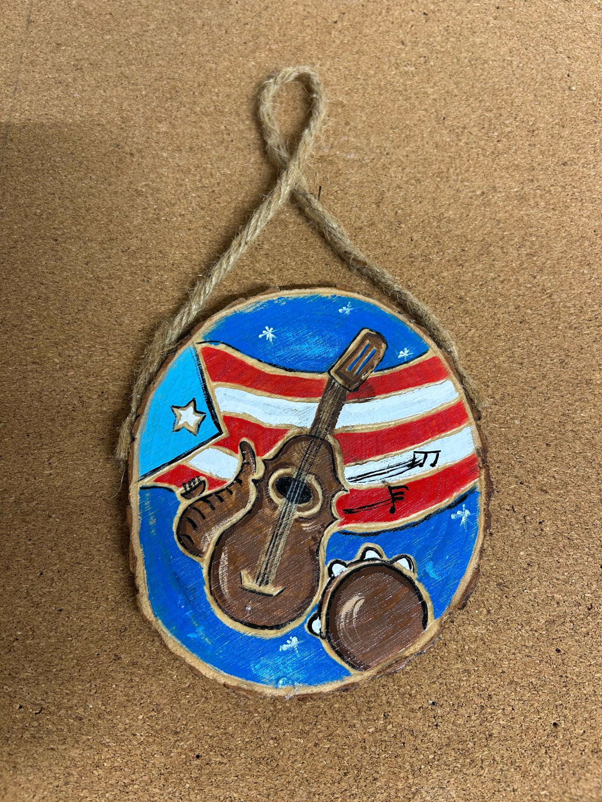 Artesanía en madera pintada a mano para colgar. Mide 5" de largo y 4" de ancho