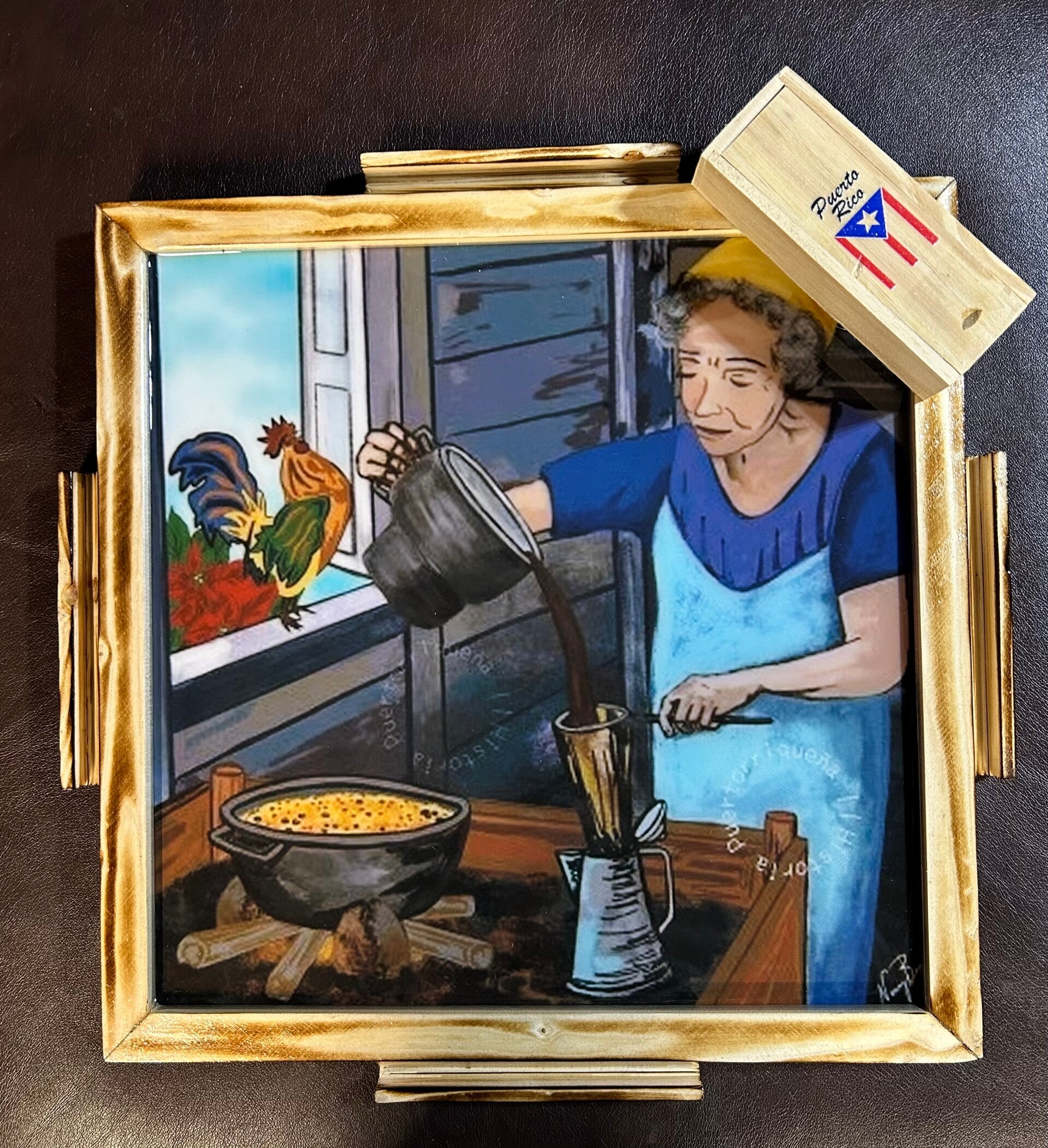 Mini mesa de domino “colando café”en madera solida con cubierta en resina. Ideal para llevar tu juego a cualquier lugar o para hacer un regalo unico a tu ser querido. Medidas 13" x 13". ( Incluye los mini dominos )